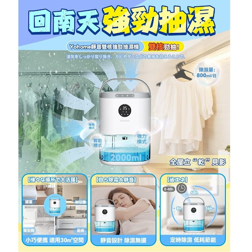 一返到屋企 濕到媽都唔認得😱😱😱 牆上流哂水😣😣😣 一定要買部吸濕機啦🥸🥸🥸 💚 新品推介💙回南天殺到‼️持續1個月🥶首款雙核抽濕機上市💦💦抽濕效果double 回南天起碼持續1-2個月,底衫褲一個禮拜都乾唔到,行兩步都驚跣親...好麻煩心情都變差埋...屋企一定要有部又靚又好用嘅抽濕機! 【新品預售】日本Yohome靜音雙核強勁抽濕機 🌀日本 Yohome 大品牌值得信賴!🌀9G6N8KNH 🌀獨創「雙核」強勁抽濕,除濕速度加倍,立“乾”見影! 🌀小巧提手便攜,大屏觸控顯示,實時反饋室內濕度,除濕更直觀 🌀靜音設計,除濕定時,節能環保,耗電量極低 🌀三種除濕模式,根據濕度情況調節智能除濕,讓環境更舒適1 🔹小藍TIPS:記得緊閉屋企所有門窗!尤其係朝南/東南嘅