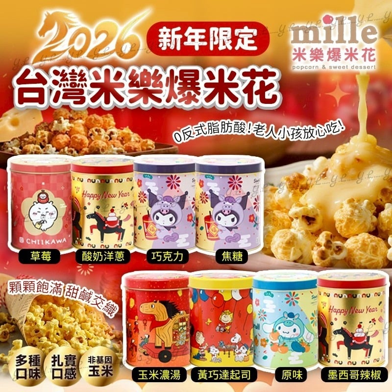 📌如欲鐵罐圖案缺貨,將隨機出貨📌 ❌沒有附袋子🛍 迎接新一年,點少得 甜蜜又香脆嘅爆米花? 🇹🇼 台灣米樂推出 新年限定口味,每一口都充滿幸福感🥰 🍿 新年限定口味 🍓 草莓|🥛 酸奶|🍫 巧克力|🍮 焦糖 🌽 玉米濃湯|🧀 巧達|🌾 原味|🌶 墨西哥辣椒 甜、鹹、微辣,多重口味任你選! 無論係睇戲、聚會、送禮,或者自己小食,全部都啱晒! 💖 產品亮點 ✔ 香脆可口,每一口都爆滿幸福 ✔ 多種口味滿足不同味蕾 ✔ 台灣直送,品質保證 ✔ 新年限定款,過年必備零食 🎁 新年好禮首選 無論送親友,定係自己享用都超適合! 一次過集齊 甜蜜 + 酥脆 + 香氣,讓新年更開心! 口味: 草莓 / 酸奶 / 巧克力 / 焦糖 / 玉米濃湯 / 巧達 / 原味 / 墨西哥辣椒 📌如欲鐵罐圖案缺貨,將隨機出貨📌 ❌沒有附袋子🛍 -產地:台灣 -規格:草莓195g/巧克力195g/黃巧達起司130g/原味195g/焦糖195g/玉米濃湯130g/酸奶洋蔥130g/墨西哥辣椒130g± 10 公克 -保存期限:生產日起計4個月 -過敏原資訊:本產品含麩質之穀物、牛奶、蛋、大豆及其製品,不適合其過敏體質食用。