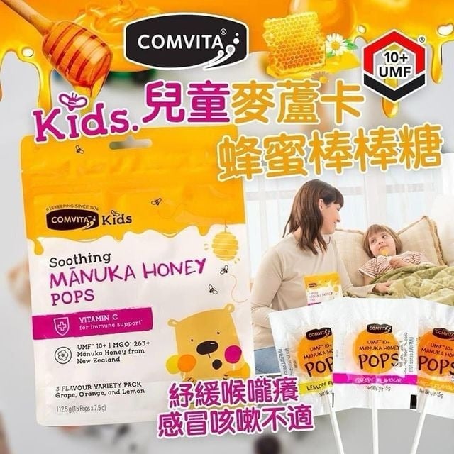 非常適合喉嚨痛和冬季感冒嘅兒童👧🏻👦🏻 🍭細路仔夜咳也非常推薦嘗試👍🏻👍🏻 一袋包含三種口味: 葡萄🍇 橙子🍊 檸檬🍋 每種5支😋小朋友實鐘意 🏆含有經認證的UMF10+麥盧卡蜂蜜(MGO263+) 和維生素C,可以幫助舒緩喉嚨不適和咳嗽❣ 2根棒棒糖相當於2個檸檬的維他命C含量,滿足小朋友一天所需的維他命C,天然蜂蜜還能潤嗓護音,舒緩喉嚨癢,提升免疫力💖 ✅100%純天然,不含人工色素或香料 ❌ 不含凝固劑 ❌ 不含防腐劑 ❌等化學成分 🙆🏻♀適合3歲以上寶寶及全家人: ▪3歲以上兒童每日最多3支 ▪3歲以下請勿食用 規格:15支裝 產地:新西蘭