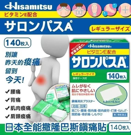 日本人氣熱賣皇牌鎮痛貼 ❌代購要 $148/盒 ❌ ✅✅日本供應商直送只係 $79/盒 ✅✅ 😌經常玩手機📱玩到頸梗膊痛🙅🏻♂️咁呢隻日本版撒龍巴斯幫到你啦🤩 無論日本人定外國人,去日本都一定會買既藥妝-撒龍巴斯鎮痛貼‼️就算香港,澳門有得買,但總覺得效果唔夠日本當地買既好用🧐今次就有日本原裝撒龍巴斯啦🤩呢隻日本成份同香港個隻有少少唔同,始終日本會將最好既留番比自己國民❤️ 針對頸椎病,肩膀僵硬,肩周炎,肌肉酸痛疲勞,腰痛腿痛,跌打扭傷,關節痛,神經痛,骨折痛,腱鞘炎等痛症 一貼幫你解決各種痛,送給父母,長輩的最佳選擇,買了都會回購日本銷量No.1💥 日本撒隆巴斯的強效鎮痛威力在日本家喻戶曉,深得一眾老人家、上班族的追捧,超人氣熱賣 想親身感受消炎鎮痛功效,從肌膚酸痛中解放? 貼上撒隆巴斯消炎止痛貼後會微微發熱,有效紓緩疼痛 ✅適用於肩膊僵硬、肌肉疲勞、肌肉疼痛、腰痛背痛、關節痛、瘀傷及扭傷等痛症,全身適用 ✅促進血液循環,配合密封式滲透特性,有效鎖住藥力,深入滲透,發揮持久鎮痛作用 ✅配合薄荷味更提神,易於撕貼,方便使用 ✅密封式滲透,有效鎖住藥力,深入滲透,發揮持久鎮痛作用 ✅老人家也可以隨意貼上使用,居家必備‼️ 容量:140枚 產地:日本