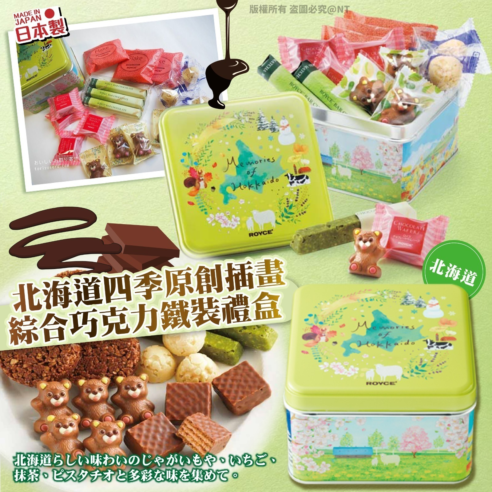 送禮自都好正呀‼️低至$159/ 盒🇯🇵😱 以北海道為印象的插圖裝滿了點心和回憶💭 以北海道的四季為印象的原創插圖的鐵罐裏🥰 配有小巧巧克力和Royce自豪的各種巧克力商品🍫🍪 罐子的4個側面分別描繪著北海道的春天🐝夏天🌱秋天🍂冬天❄️的美麗風景和可愛的動物們🧸 一起感受感受北海道地域風情🇯🇵 ✨禮盒內容:5種類總計18個 1️⃣小熊巧克力5個 2️⃣巧克力威化4個 3️⃣馬鈴薯白巧克力3個 4️⃣抹茶巧克力棒3個 5️⃣巧克力脆薄片3個 又精緻又特別😍 內裡最吸引嘅系開心果味熊熊朱古力🧸 加上其他ROYCE嘅精選朱古力小食🍫 係最適合不過嘅送禮佳品🎁 最佳食用限期(Best Before):出廠日計90天