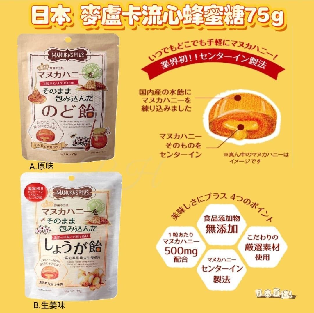 這款流心蜜蜂糖🐝是用來自紐西蘭稀有且珍貴的麥盧卡蜂蜜製造‼️麥盧卡蜂蜜從中間慢慢融化🍯將風味與香氣一同散開在口中,每一粒含有約500毫克麥盧卡蜂蜜,粒粒爆漿😋 ✅蜂蜜具有天然的滋潤作用,有助於緩解喉嚨乾燥、痕癢及輕微的喉嚨痛。 ✅蜂蜜含有抗菌活性成分,有助於消炎並增強抵抗力。 💜2款可選💜 A.原味 B.生姜味 ⏳賞味期限:180-365日 ▪️尺寸:127x190x60mm ▪️重量: 82g
