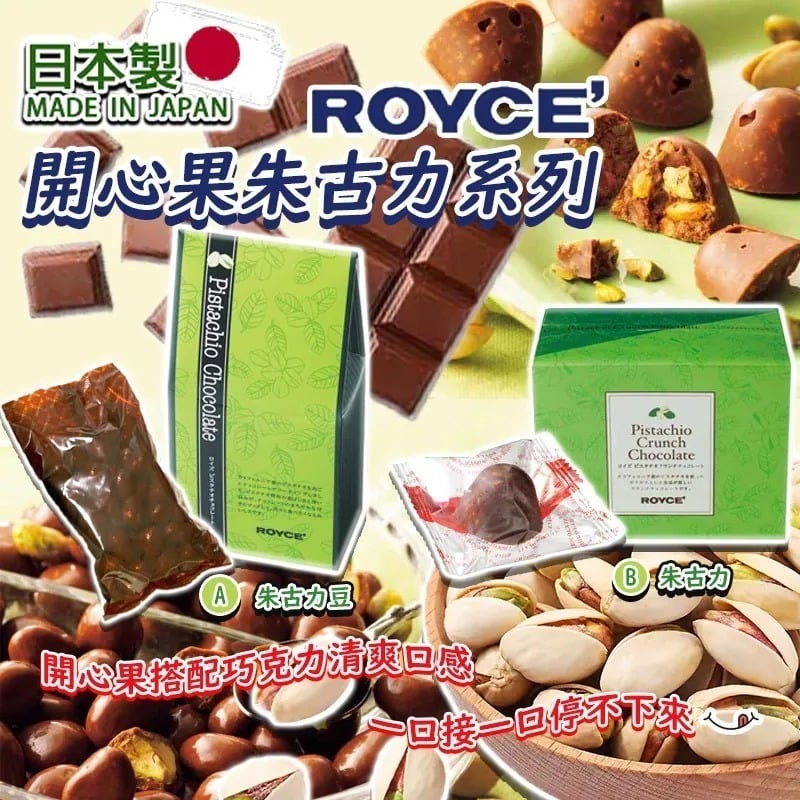 一定要試, 絕對係最好食既開心果朱古力🥳!!! 🤤🤤好食到唔停唔到口呀😜😜日本同事超級推介👍👍 太多靚靚不停問會唔會有🤣我哋更係唔會令大家失望啦😜 Royce 開心果朱古力,美國加州開心果逐D逐D加入牛奶朱古力入面🍫 開心果特有既質地同口味與朱古力的清爽口感簡直係絕配。 ✨兩款不同口感任揀✨ 😋朱古力豆 香脆醇厚,整個開心果包裹巧克力, 開心果獨特的質地和風味與巧克力的清爽口感完美搭配。 實在是太美味了,讓人忍不住伸手去拿。 😋朱古力 開心果的魅力越嚼越深。 粗碎的加州開心果、餅乾脆餅和杏仁與注入開心果醬的牛奶巧克力相結合。 口感鬆脆,開心果的香氣和味道也更加濃郁。 ✈️空運直送到港✈️