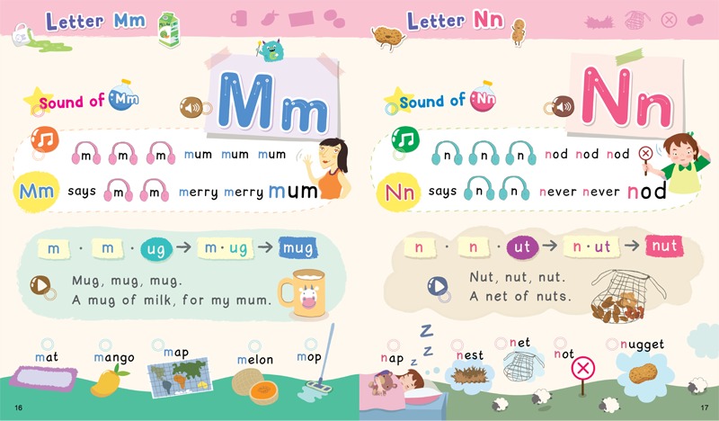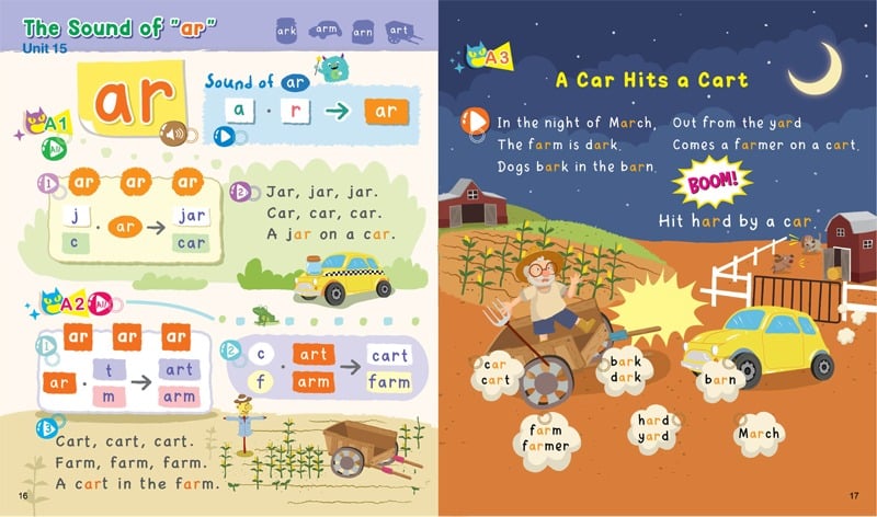Go! Finger Phonics 情景大圖 詞彙豐富 動動手指 立即會讀 強大互動功能 提高學習效率 內容有什麼特色? 📕1.培養語感 (磨耳朵時期) 英語不是母語,如何培養語音敏感度? 新生嬰兒一出生,第一個打開的器官就是耳朵,所以孩子對聲音有與生俱來的敏感度,只要給孩子足夠的聽覺輸入,通過反復不斷的聽聽聽,就可以學懂語言,因為孩子對語言天生就有敏銳的聽力。 在聲音的引領下,不管學什麼語言都會很輕鬆,因為語言學習本就是0-6歲幼童生而有之的能力! 📕2.要學好英語,從培養英語耳朵開始 幼童學語言需要大量的聽力輸入 (listening input),對於學習非母語的英語,語音和文字的要求更為嚴格: 1. 咬字要清晰; 2. 語速不快不慢; 3. 抓住表音文字的特性,發揮押韻的吸引力; 4. 配樂要輕柔而有節奏,既不能過大干擾聽音,又要剛好幫助孩子能隨著節奏跟讀… 5. 有意義有情景的內容,可輕鬆記憶 香港洛斯擁有眾多的兒童英語學習版品,編輯團隊有豐富的教學經驗,專業體現於了解孩子的學習心理及版品設計能力,同時兼顧圖像、文字、聲音、配樂、排版、電子技術…等。 📕3.為什麼要學好英語要從Phonics (自然拼讀法) 入手? 因為英語是”表音文字” (相對的中文是”表意文字”),聲音最重要!自然拼讀法直接學習26個字母(字形)與發音之間的規律,最終達到看字讀音,聽聲拼詞的目的。 誦讀文字、聲音輸入,孩子跟讀,聲音輸出,加上圖像、動畫而了解圖意,循序漸進,層層滲透… …。 這2本手指自然拼讀書,讓孩子手指點到哪,嘴巴念到哪,大腦、眼睛、耳朵、嘴巴,全部動起來,讓字母發音(letter sound)、詞彙(vocabulary)、韻文(chanting)結合,孩子只要能琅琅上口 📕4.掌握拼讀 (Phonics) 英語只有26個字母:5個元音和21個輔音。所有的英語單詞都必須配有元音才能發出聲音,所以學好元音、輔音,以及它們的組合特性,就可以拼讀出大量英語單詞。 系統學習編排systematic instruction對學好自然拼讀極為重要。讓孩子對5個元音short vowels有基礎認識,再學習21個子音consonants與5個元音short vowels配搭,書中內容精挑細選,涵蓋5個元音的不同組合,讓孩子更容易掌握發音規律。 組合從CVC詞彙開始。所謂CVC (Consonant + Vowel + Consonant),即一個單詞由2個子音及1個短元音組合,如cat, man等, 最容易令孩子掌握英語發音及拼讀的基本概念。 📕5.開口講英語 從聽懂英語到會說英語,由輸入轉化為輸出,需要漫長的過程,聽理解不斷練習開口表達。 孩子不適合枯燥和機械化的學習方式,如何使這個過程變得有趣呢? 手指拼讀能輕鬆實現,將聲音化成有意義的語境picture scenarios,配合學習目標的元音或子音,加上詞彙組合成有意義的詞組phrase、句子sentence及詩詞poem,搭配歌謠、插圖、動畫,孩子就能掌握音形的對應關係,快速進行單詞的拼讀與拼寫。 視頻參考 https://youtu.be/yyfLDcHchK0?si=3mfQ-xBPYlmEs8_0