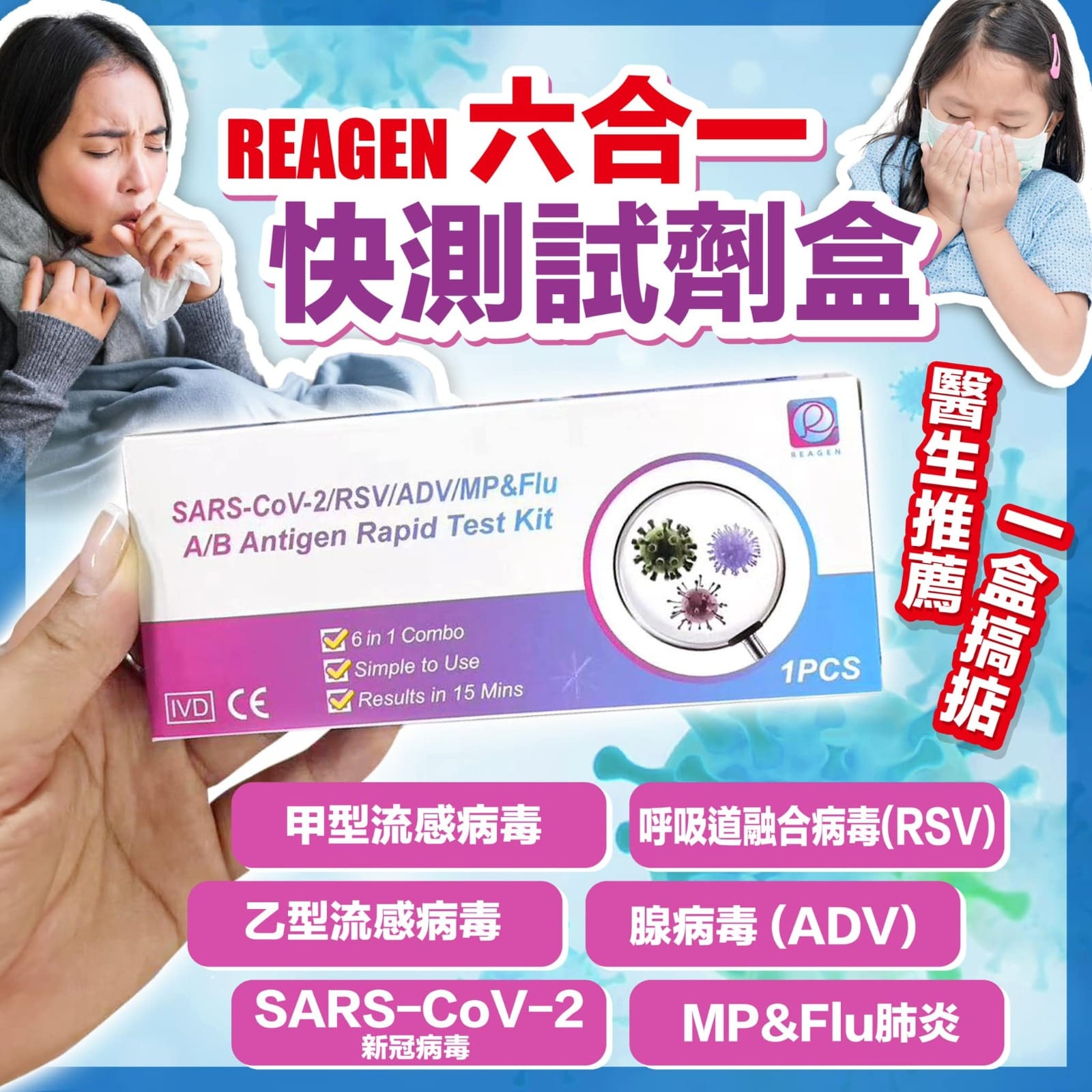 REAGEN-(6合1)新冠病毒/甲/⼄型流感/RSV合胞/ADV腺病毒/MP&Flu肺炎快速抗原檢測試劑盒10支(獨立包裝)