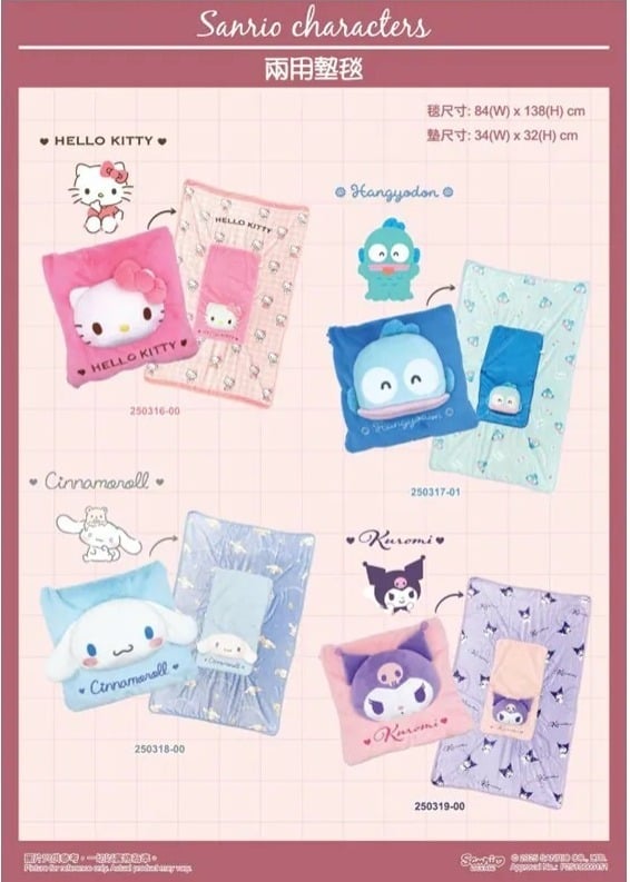 🌈Sanrio 💯% 正版授權‼️ Sanrio 粉絲齊齊買,迎接冬天來臨🥶齊齊暖笠笠♨️ 🌈4款可選🌈 A. Hello Kitty B. 海怪 C. 玉桂狗 D.Kuromi ▪️毯尺寸: 84(W)x138(H)cm ▪️墊尺寸: 34(W)x32(H)cm ▪️產地: 中國