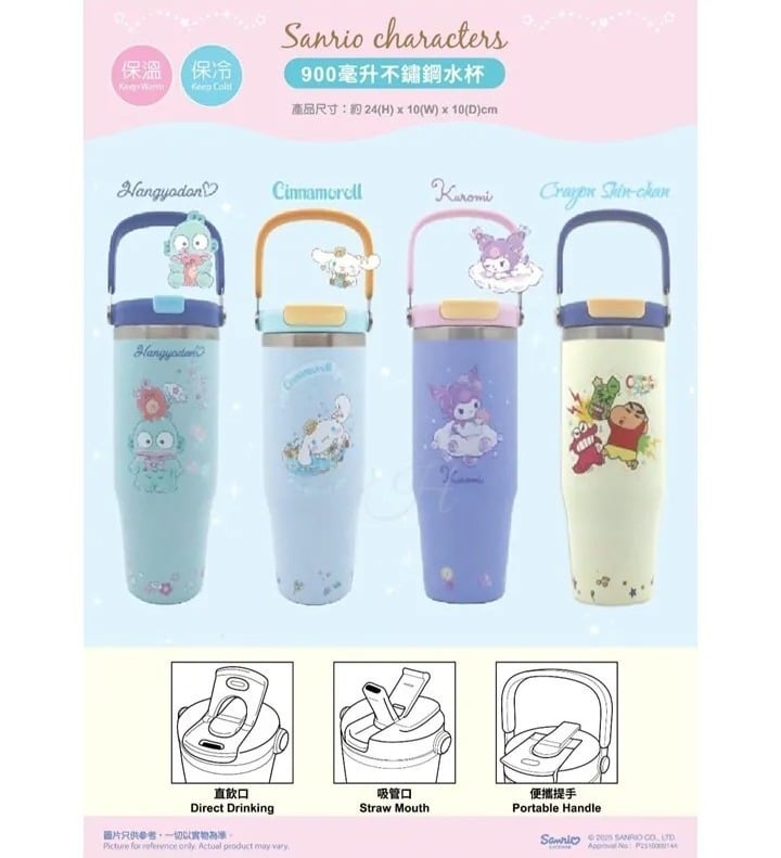 🌈Sanrio 💯% 正版授權‼️ 💖美觀實用又可愛嘅Sanrio角色水樽,配有多功能杯蓋,加上9️⃣0️⃣0️⃣毫升超大容量,能補充一天所需的水分🥛 ✔️保溫保冷兼具,一杯就搞定。 ✔️2種貼心設計,直飲口與吸管口。 ✔️矽膠密封不怕漏,讓你輕鬆暢飲不漏水! ✔️杯瓶帶提手,便於攜帶。 🌈3款可選🌈 A. 海怪 B. 玉桂狗 C. Kuromi D.蠟筆小生 ▪️尺寸:24(H)x10(W)x10(D)cm ▪️產地: 中國