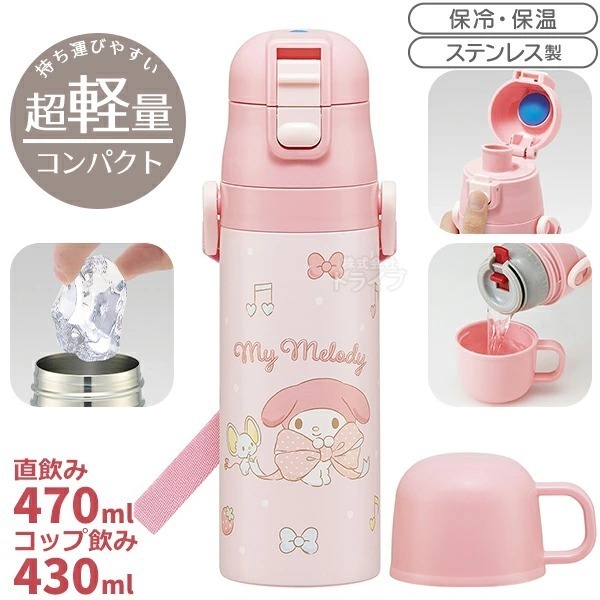 該設計有兩種(2 Ways)使用方式: - 直飲型 - 杯飲型(溫熱飲用時推薦使用) -可直接飲用的瓶蓋裝置具有鎖定功能,可防止因故障而打開和關閉。 -大口徑,使冰容易進入。 產品連有名牌和姓名貼紙的肩帶。 由於採用真空兩層結構,因此具有持久保暖御寒效果 保溫效果:45度以上(24小時) 降溫效果:8度以下(6小時) 容量 : 直接型 : 470ml 杯飲類型:430ml 產品尺寸: 約寬68mm x 高230mm 重量 : 直接型 : 295g 杯飲類型:290g 中國製